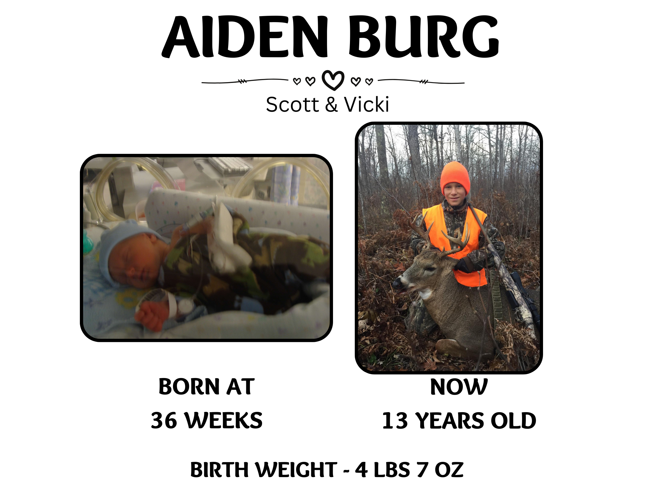 Support NICU babies with a personalized poster featuring their name, gestational age, birth weight, and birth photo, displayed along the Henry’s Heroes walk. See Aiden’s poster for reference. Posters are reused yearly, so get one annually to track your baby’s growth!